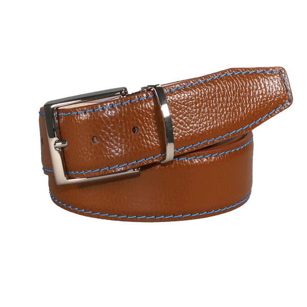 For the modern dapper man, our Elio Cognac Italian Pebble Grain Leather Belt is the perfect finishing touch to any ensemble - professional or formal. Crafted with 100% Italian calf leather and lined with nubuck, it's the epitome of luxury. Choose from cognac, cobalt, tan, and white, and customize the stitching color, size, and width for a truly unique designer accessory. Plus, all thread colors are specifically chosen to match the belt's hue, allowing you to choose with confidence. Pebble grain leather is also called pebbled leather or scotch grain leather. It is said the innovative textured style is attributed to the Scottish, with tales attributing its origin to a pile of hides on a pebble floor, or barley dross from the whiskey-making process. Our belt is handmade with 100% premium Italian leather and includes a signature travel pouch and solid brass Palladium Plated Buckle. Smart and stylish - you can't go wrong.